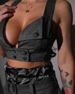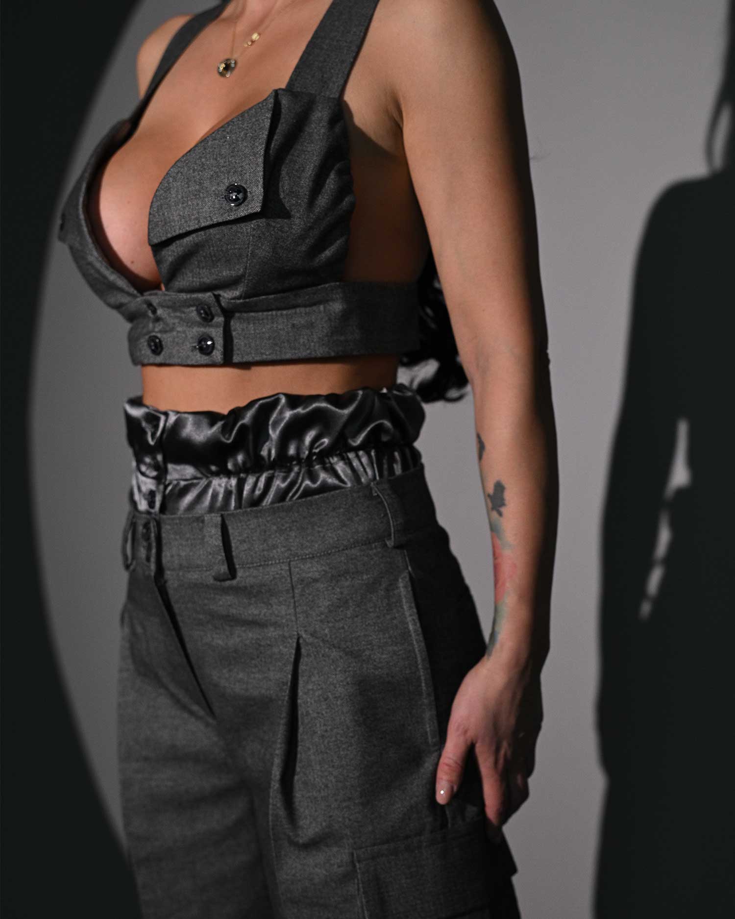 Bustiera old school din stofa cu bretele in X la spate si inchidere cu nasturi in fata. Se poate purta peste o camasa, bluza sau chiar vara pe piele cu sacoul si pantalonii Old School pentru un look complet. Este confectionata dintr-o stofa din lana moale la atingere, captusita.