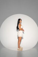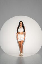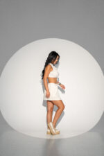 Compleu din in, bustieră și fustă, în nuanță bej cald cu imprimeu subtil ce imită textura nisipului. Ambele piese au închidere cu nasturi, buzunare funcționale și falduri care adaugă lejeritate. Talia este ajustabilă cu siret, oferind un plus de versatilitate și confort. Un outfit ideal pentru plajă sau vacanță, ce înlocuiește clasicele ținute estivale cu un look fresh și natural.