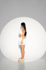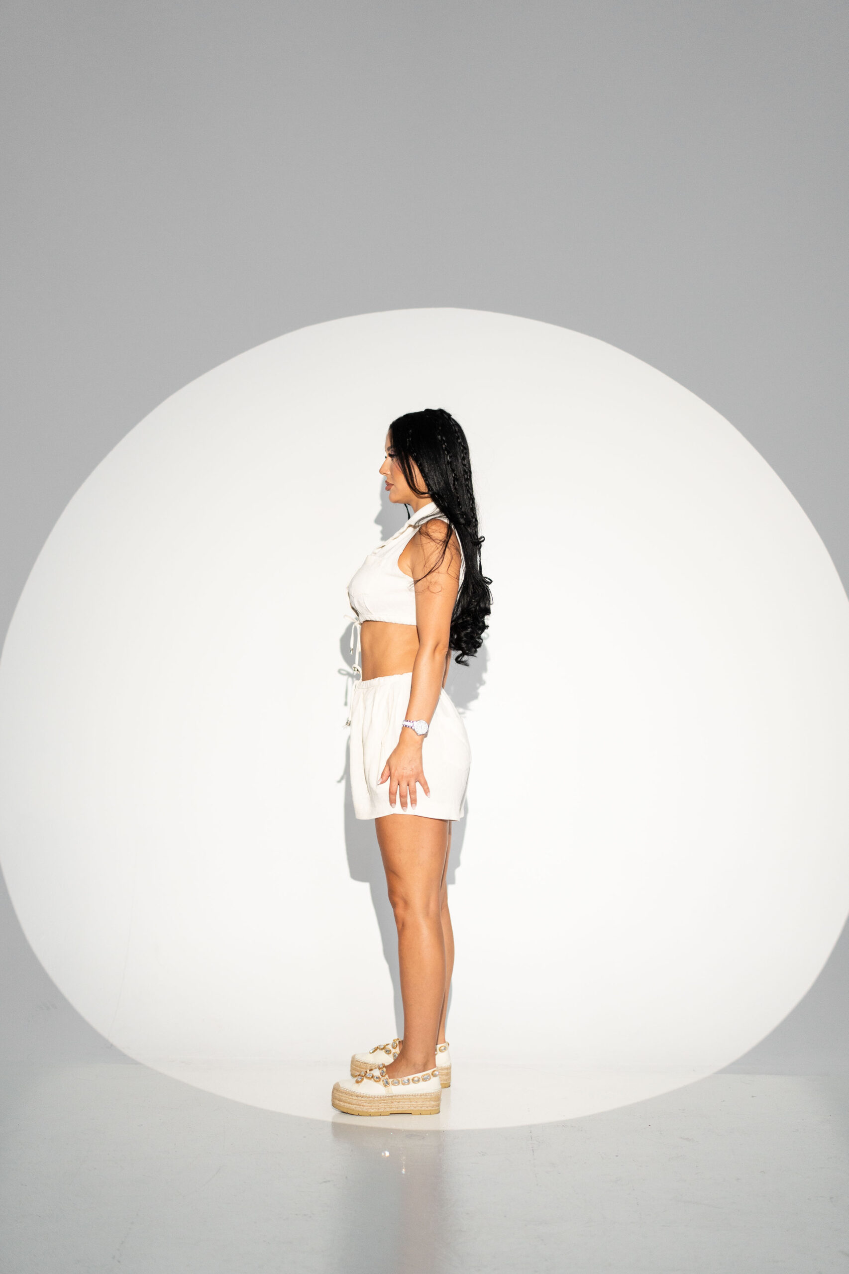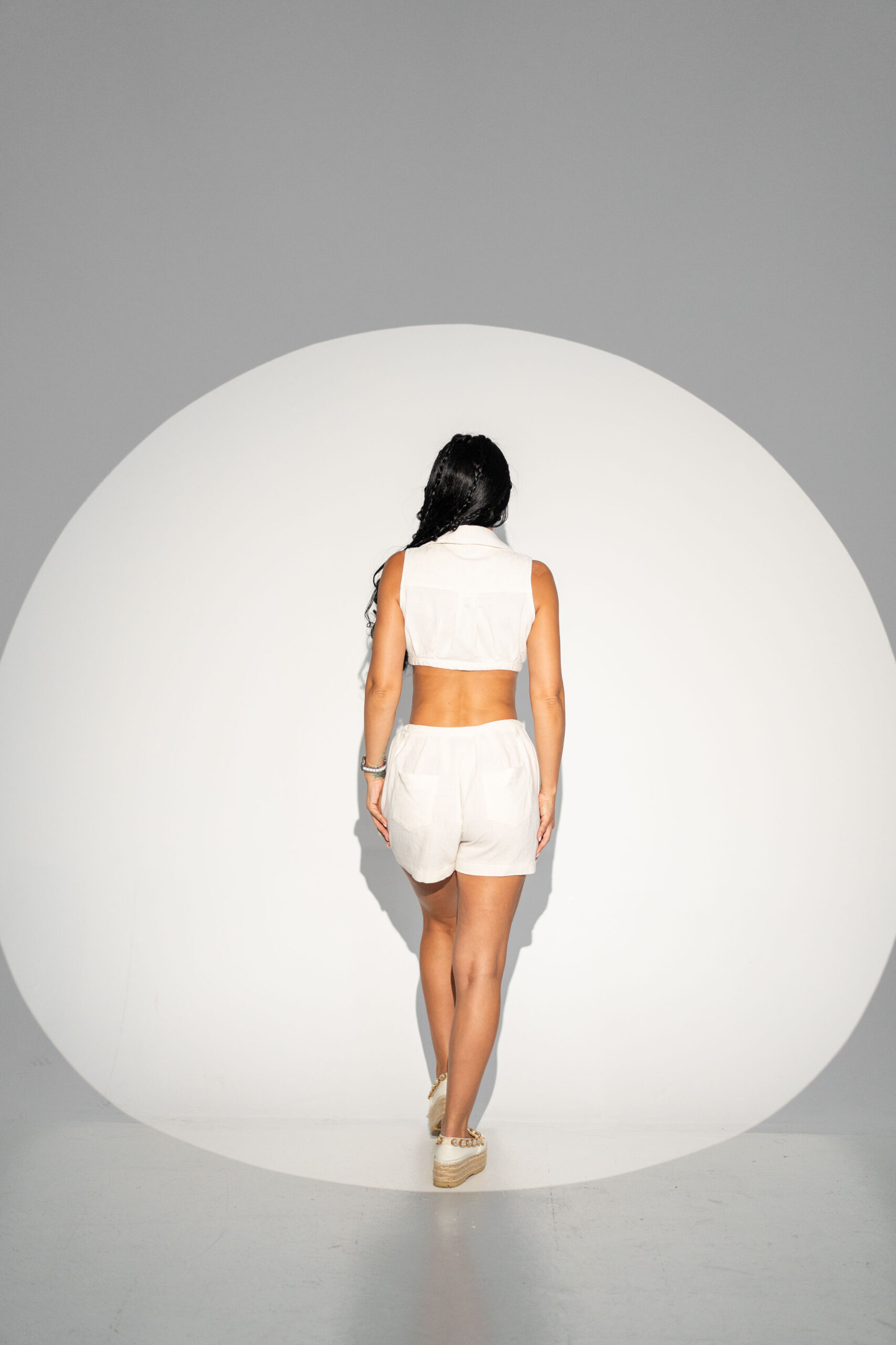 Compleu in, bustieră și pantaloni scurți, în nuanță bej cu imprimeu discret ce imită textura nisipului. Construit pentru zilele calde, outfitul este format din două piese lejere cu nasturi frontali, buzunare funcționale și talie ajustabilă prin siret. Pantalonii scurți oferă libertate de mișcare, iar bustiera evidențiază natural bustul. Un look estival și relaxat, ideal pentru plajă, vacanțe sau ieșiri în aer liber.