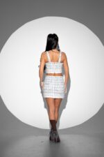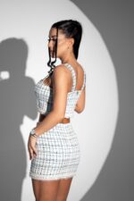 Costum in carouri, din stofa boucle tip chanel cu micropaiete, compus din bustiera si fusta. Ambele piese festimentare au captuseala, fermoar pentru inchidere si banda de perle ca si detaliu. Este o tesatura din lana care lasa pielea sa transpire asadar este potrivita pentru sezonul cald. Acest costum te va face o aparitie deosebita , luxurianta si rafinata. Stilul clasic al tesaturii se combina perfect cu modelul croielii actualizat trendului.