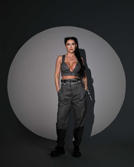 Pantaloni damă oversize din stofă cu dungi, modelul poartă mărimea S