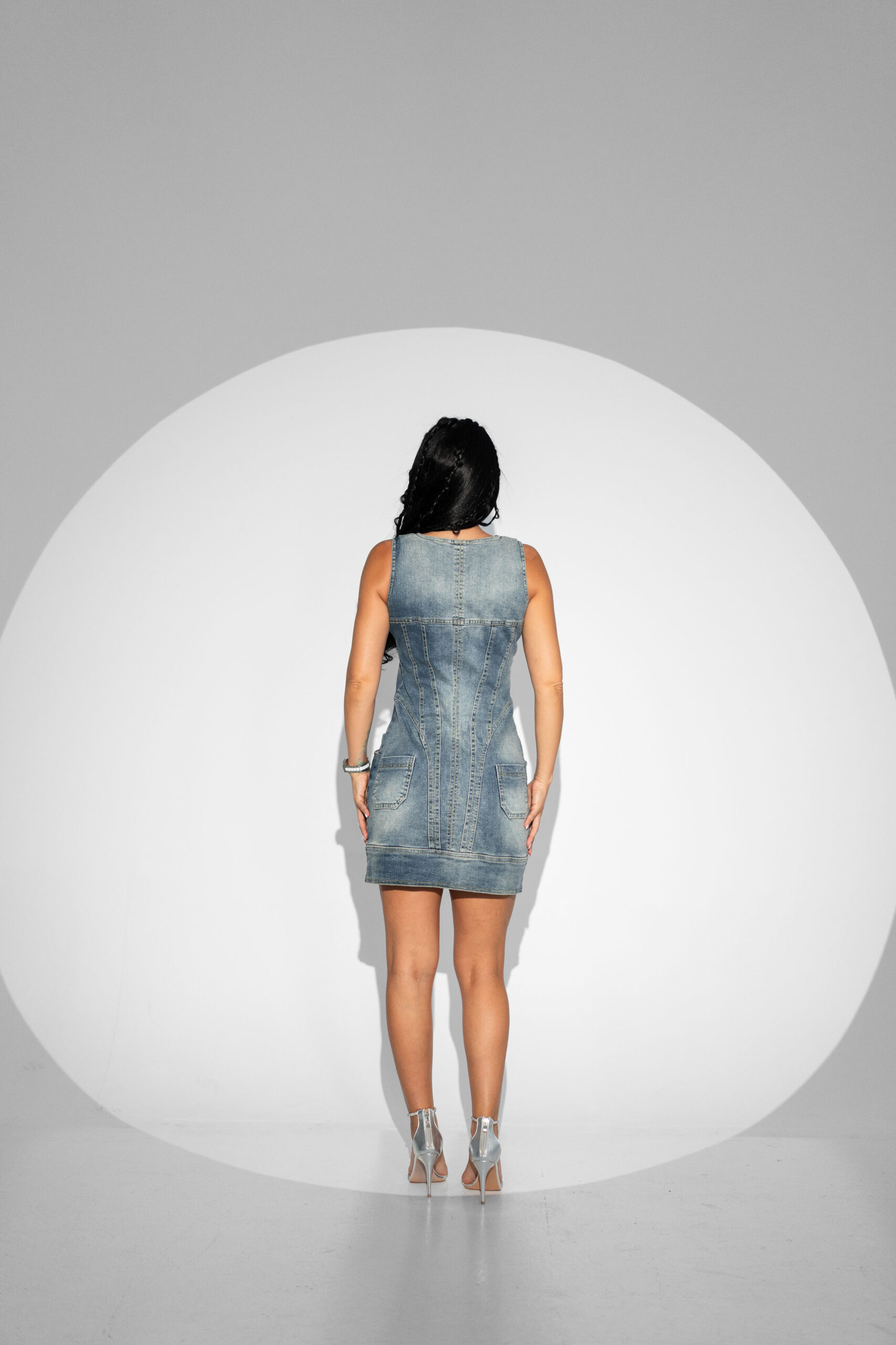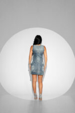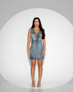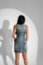 Această rochie de blugi este realizată dintr-un denim de bumbac ușor elastic, ce se mulează armonios pe siluetă. Croiala în stil corset evidențiază delicat talia și bustul, oferind un look feminin și rafinat. Fermoarul frontal adaugă un accent modern și facilitează o închidere practică și comodă. Rochia este un produs 100% românesc, finisat cu atenție printr-un proces de prespălare, pentru un aspect plăcut și o textură moale la atingere.