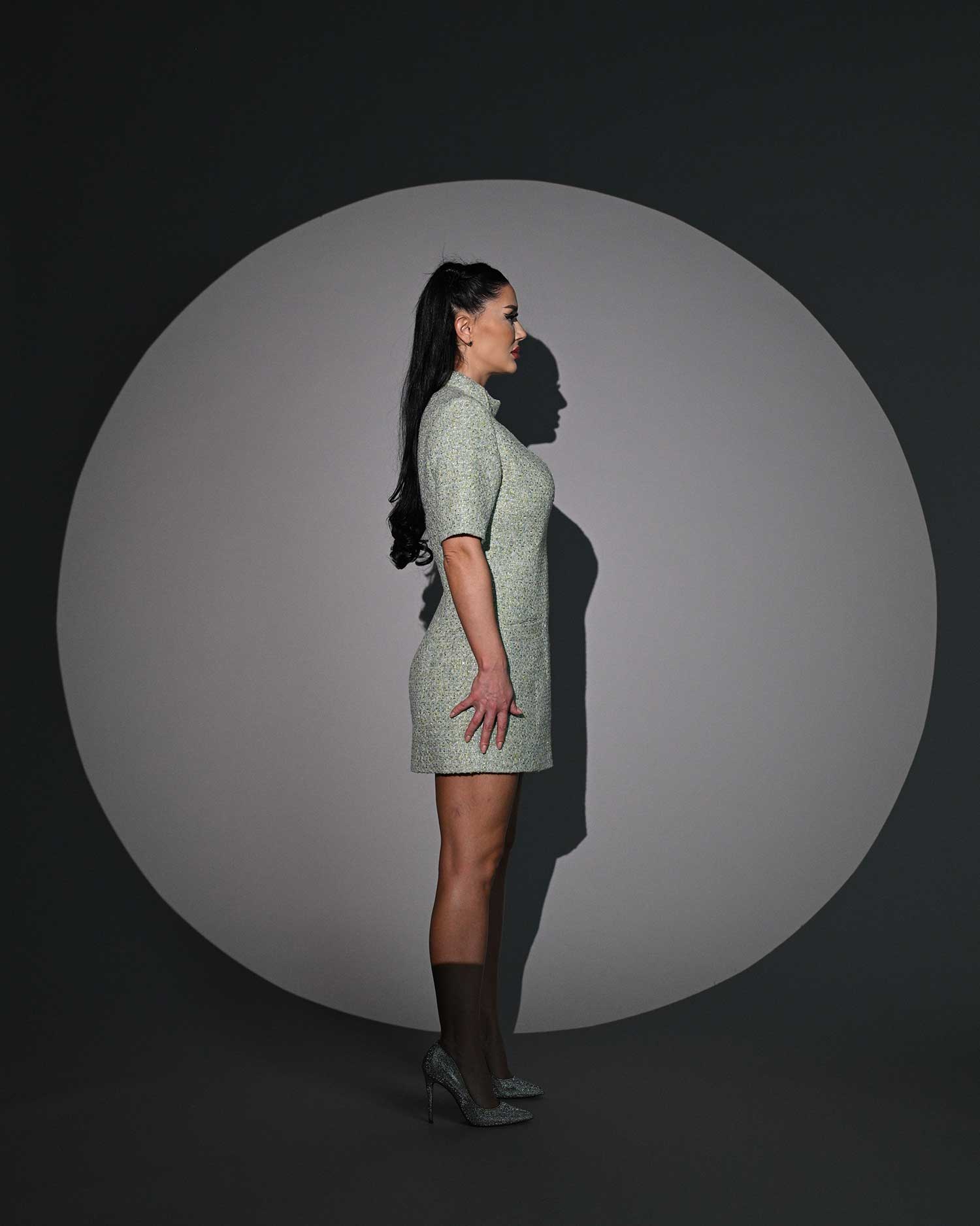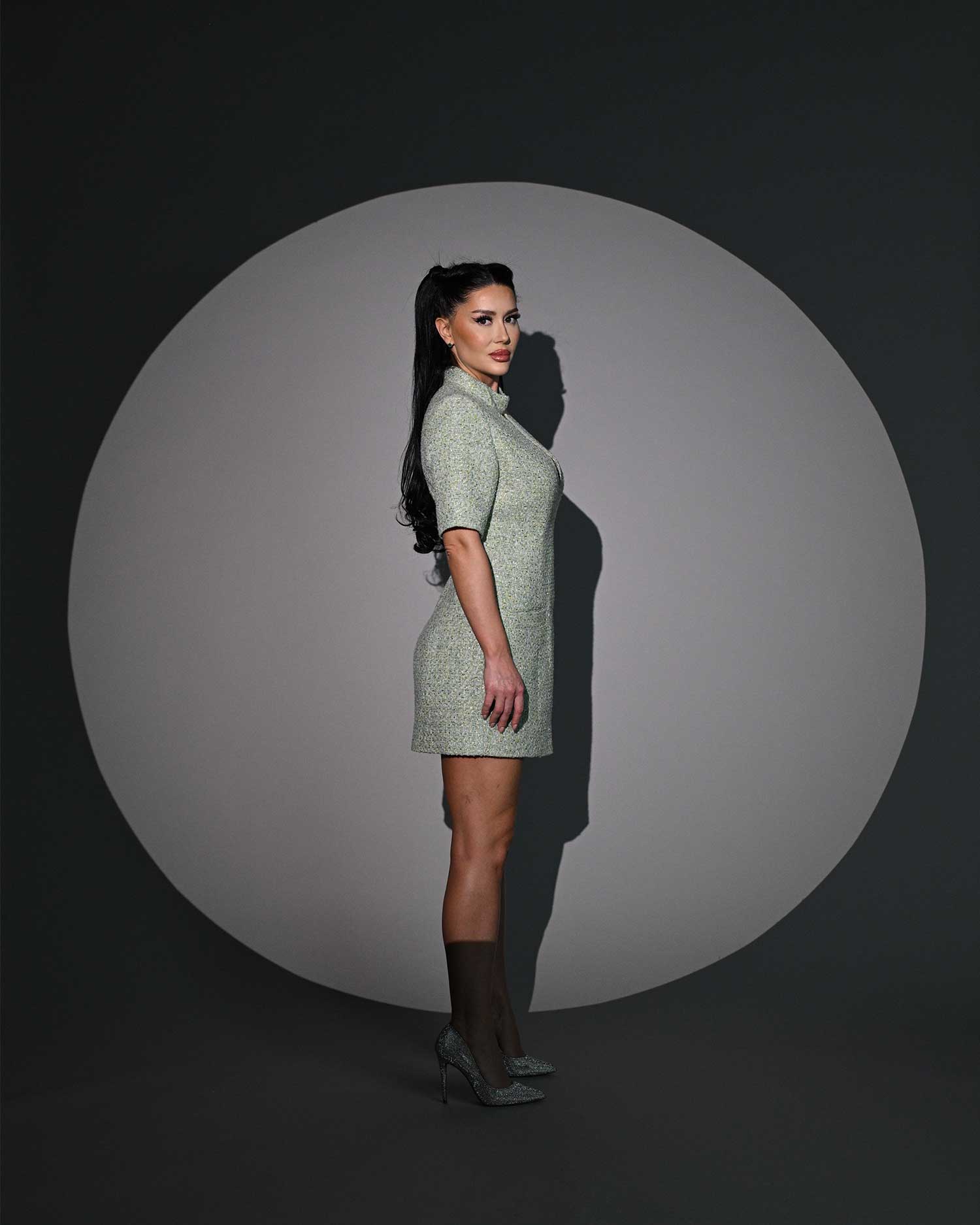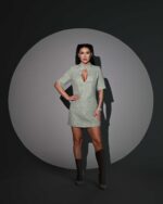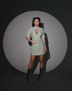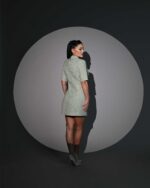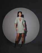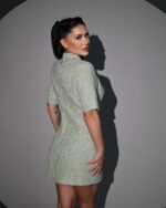 Rochie de culoare verde menta, confectionata dintr-un material pretios cu micropaiete aurii cusute, captusita, cu un croi cambrat ce subliniaza delicat formele.
