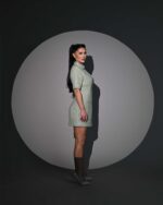 Modelul poartă măsura S dimensiuni bust 94 / talie 65 / șold 94, Înălțime 1,65 cm.