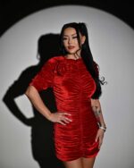 Rochie din catifea rosie cu maneci raglan „VELVET FUSION”