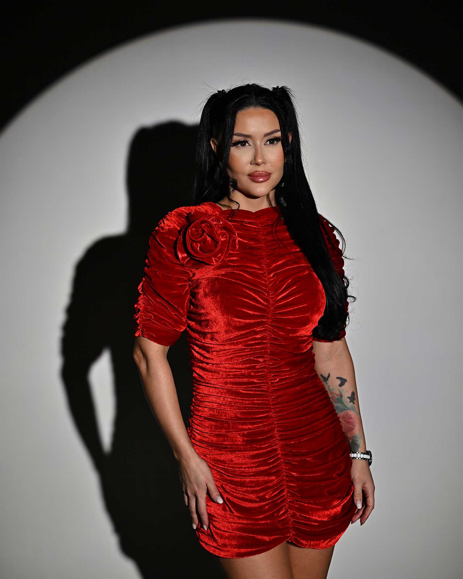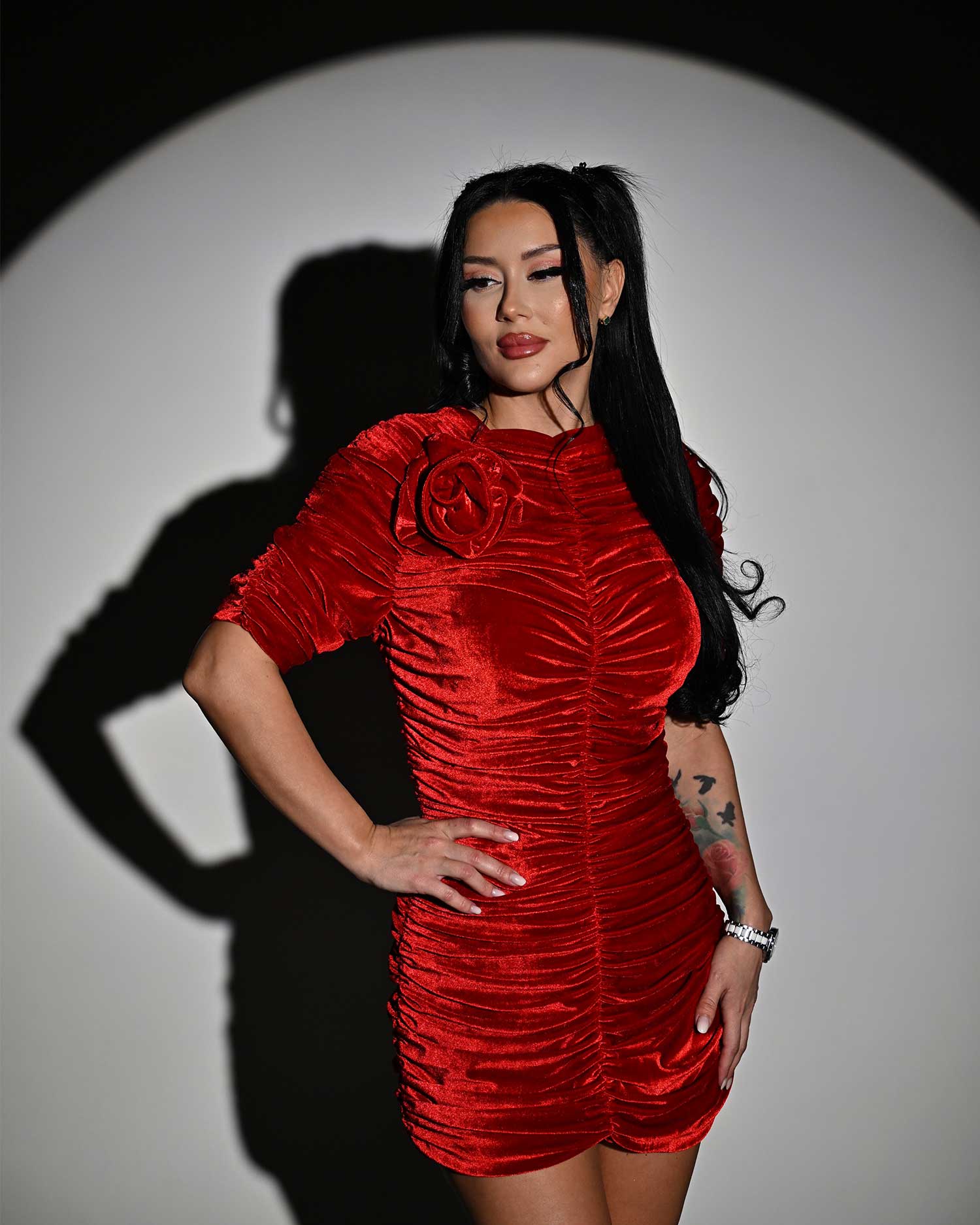 Rochie din catifea de culoare rosie cu maneci raglan si cusaturi incretite. Aceasta croiala ofera un look modern. Este usor de ajustat pe orice silueta si creeaza un joc fluid de culoare si textura. Are detaliu trandafir cusut si inchidere cu fermoar ascuns la spate.
