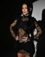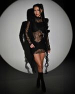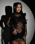 Rochie scurta realizata dintr-o lycra de calitate nude si dantela chantilly nagra. Bandajul din dantela aplicat de bust si zona soldului ofera un design senzual si modern. Este accesorizata cu trandafiri cusuti si volane din dantela in cascada.